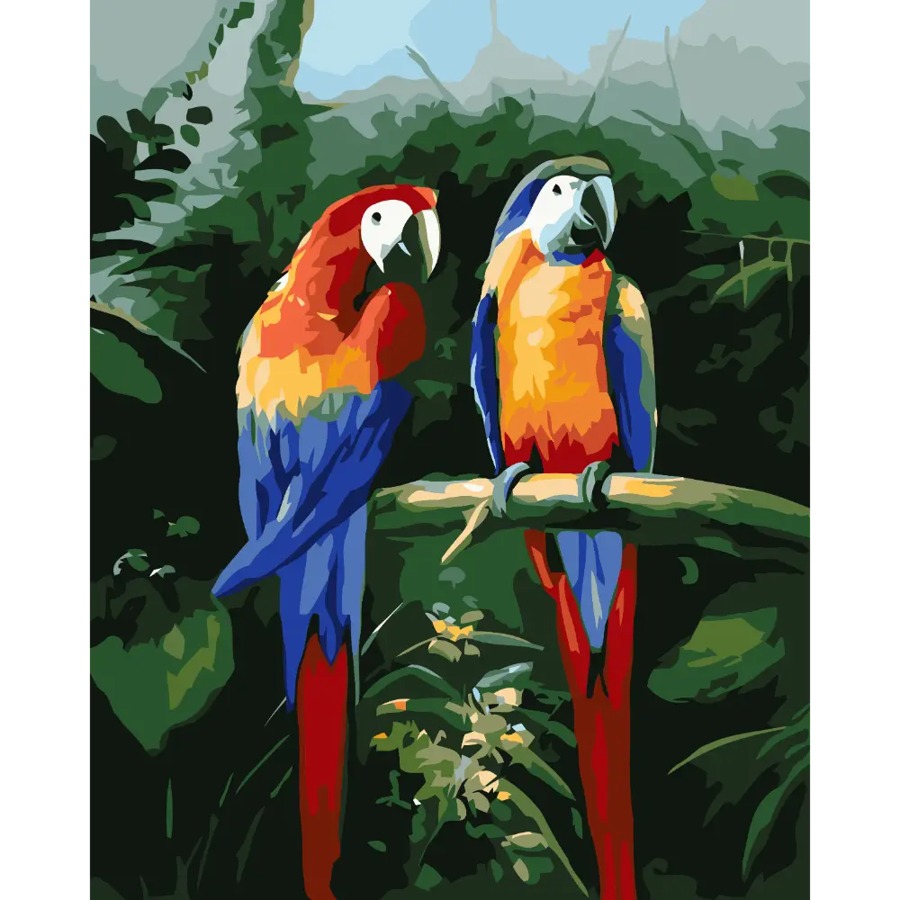La Peinture par numéros Duo de Perroquets est une véritable cure de bonne humeur. En peignant ces deux oiseaux emblématiques, vous travaillez sur une harmonie chromatique puissante : le rouge ardent, le bleu profond et le jaune solaire contrastent magnifiquement avec les nuances de vert de la jungle. C’est l’œuvre parfaite pour apporter une touche d’exotisme et de caractère à une pièce un peu sobre ou pour compléter une décoration d’inspiration « Urban Jungle ».
